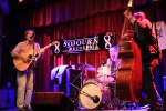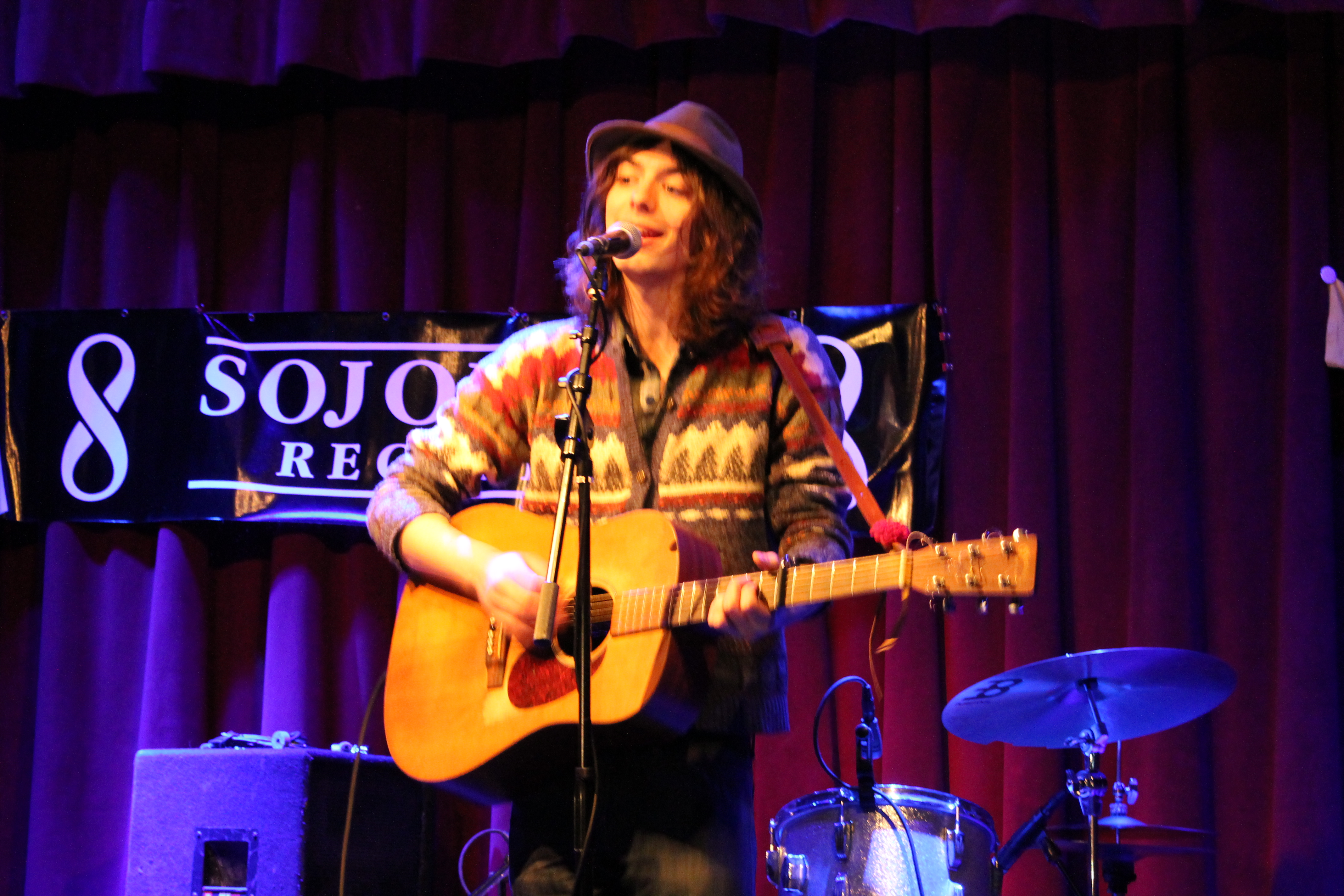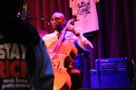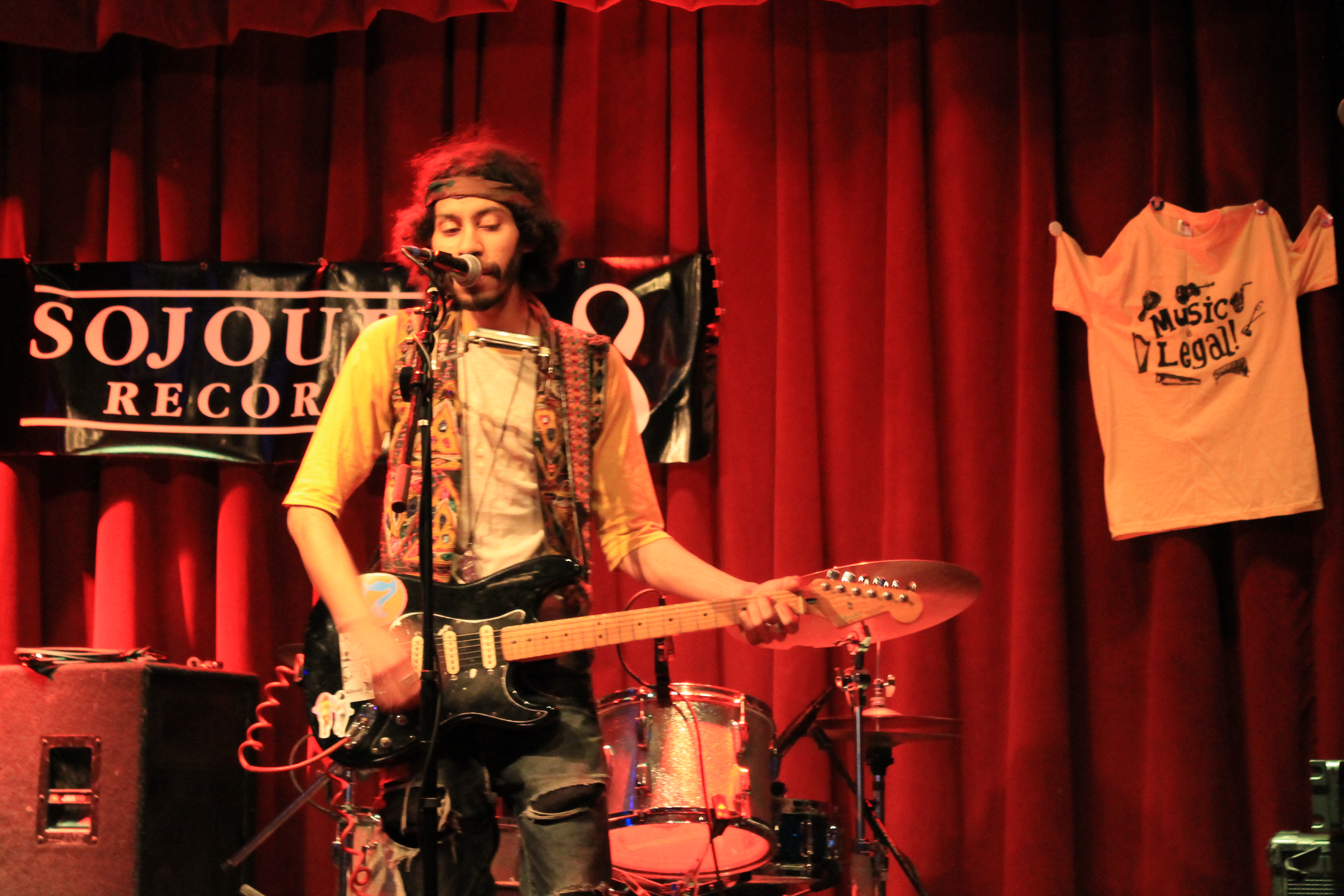 Theo Eastwind suggested we sell the leftover “Music is Legal!” t-shirts at the 5th Busker Ball last Thursday at Spike Hill so I went to set up a merchandise table and took a lot of blurry shots of the show. We even got one of our shirts pinned up to the curtain with Blueberry Season pins.