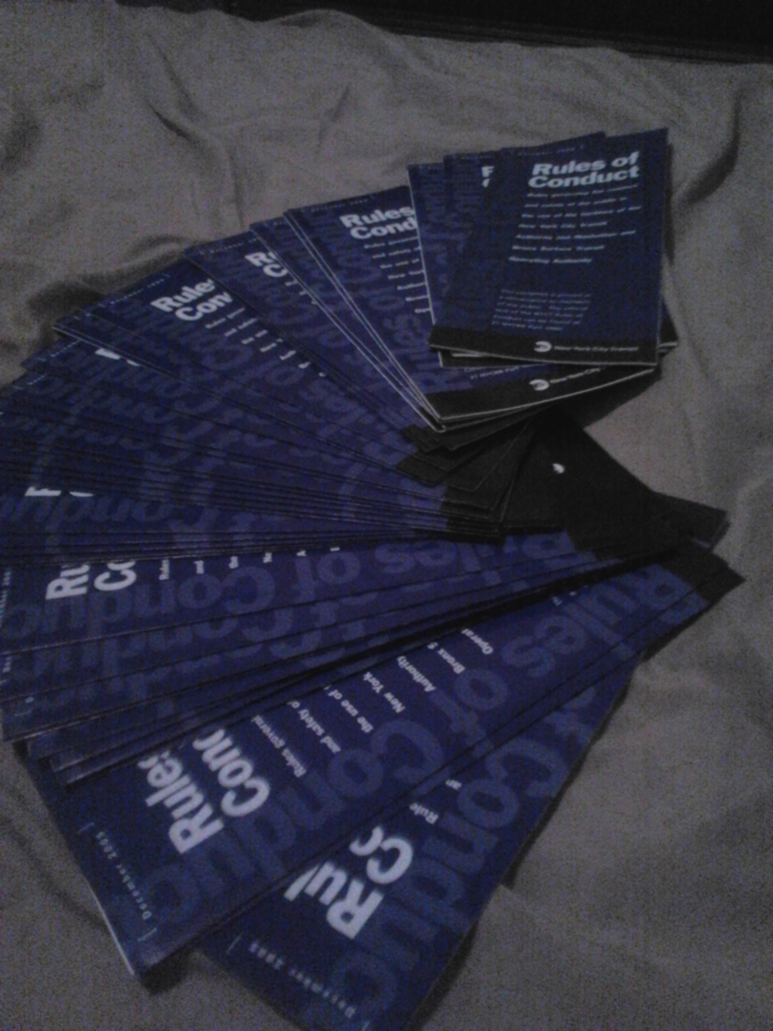 “I called someone at New York City Transit; she has a Rules of Conduct booklet dated 2005 (which I am told is the most recent); if you want to pick it up, you can call [redacted] or she can mail it to you.”